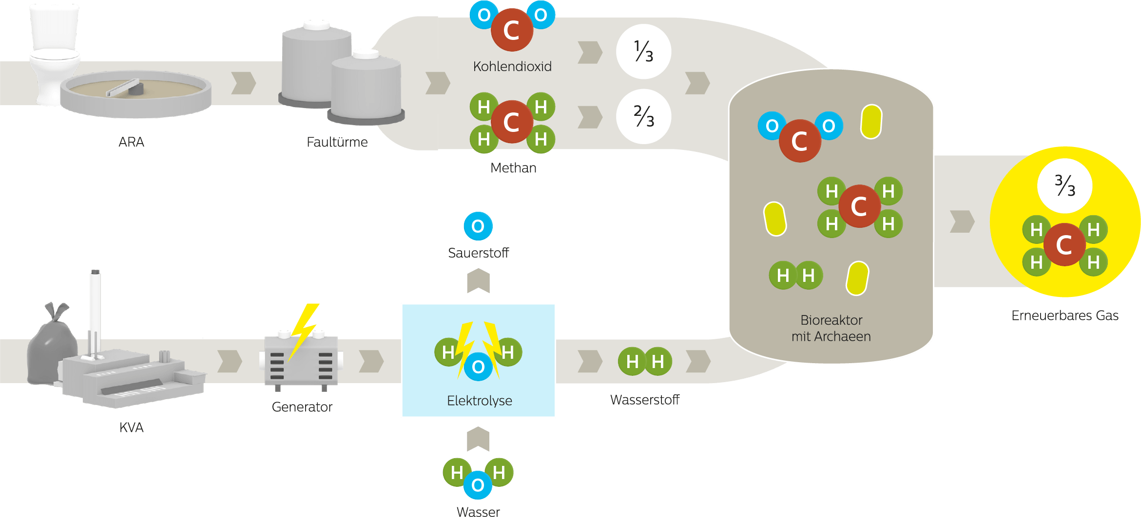 Bei der Reinigung des Abwassers in der ARA entsteht Klärschlamm. Nach einer Vorbehandlung wird er in Faultürmen über 20 Tage lang umgewälzt, erwärmt und gefault. Beim Faulungsprozess wird der organische Klärschlammanteil abgebaut, wobei Klärgas entsteht. Das biogene Klärgas setzt sich zu circa zwei Dritteln aus Methan und circa einem Drittel aus Kohlenstoffdioxid sowie Spuren von anderen Gasen wie Stickstoff, Wasserstoff und Schwefelwasserstoff zusammen.
